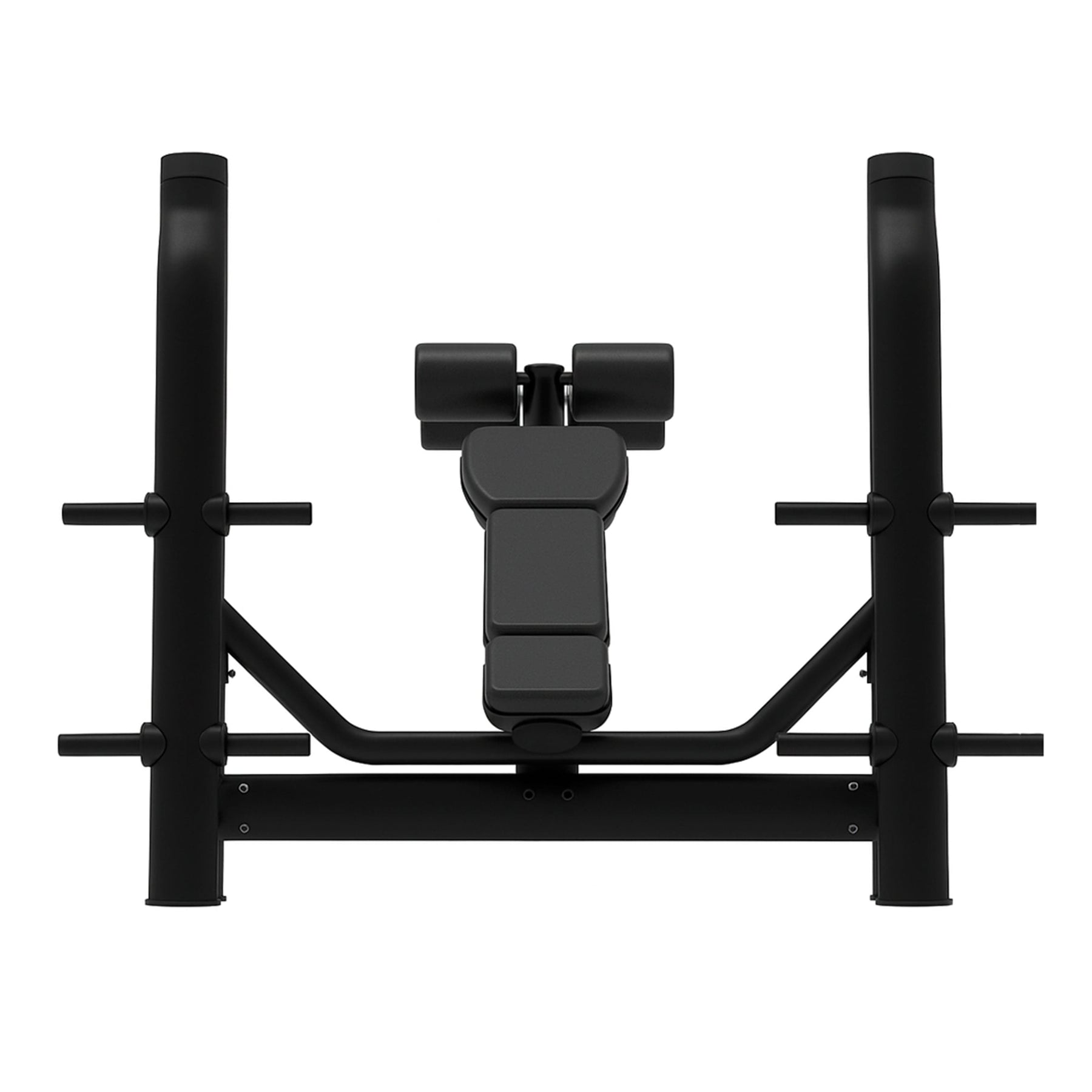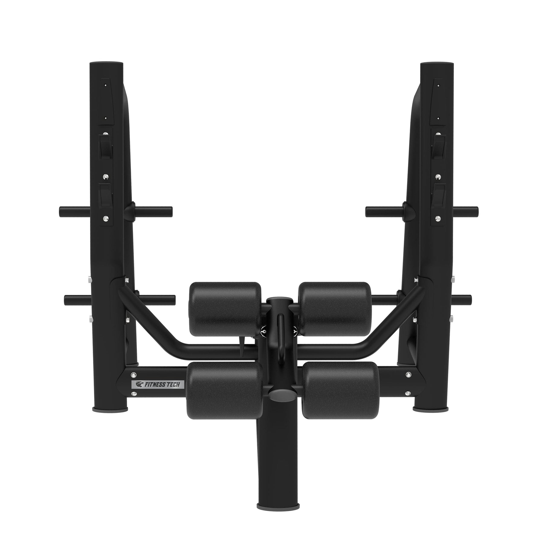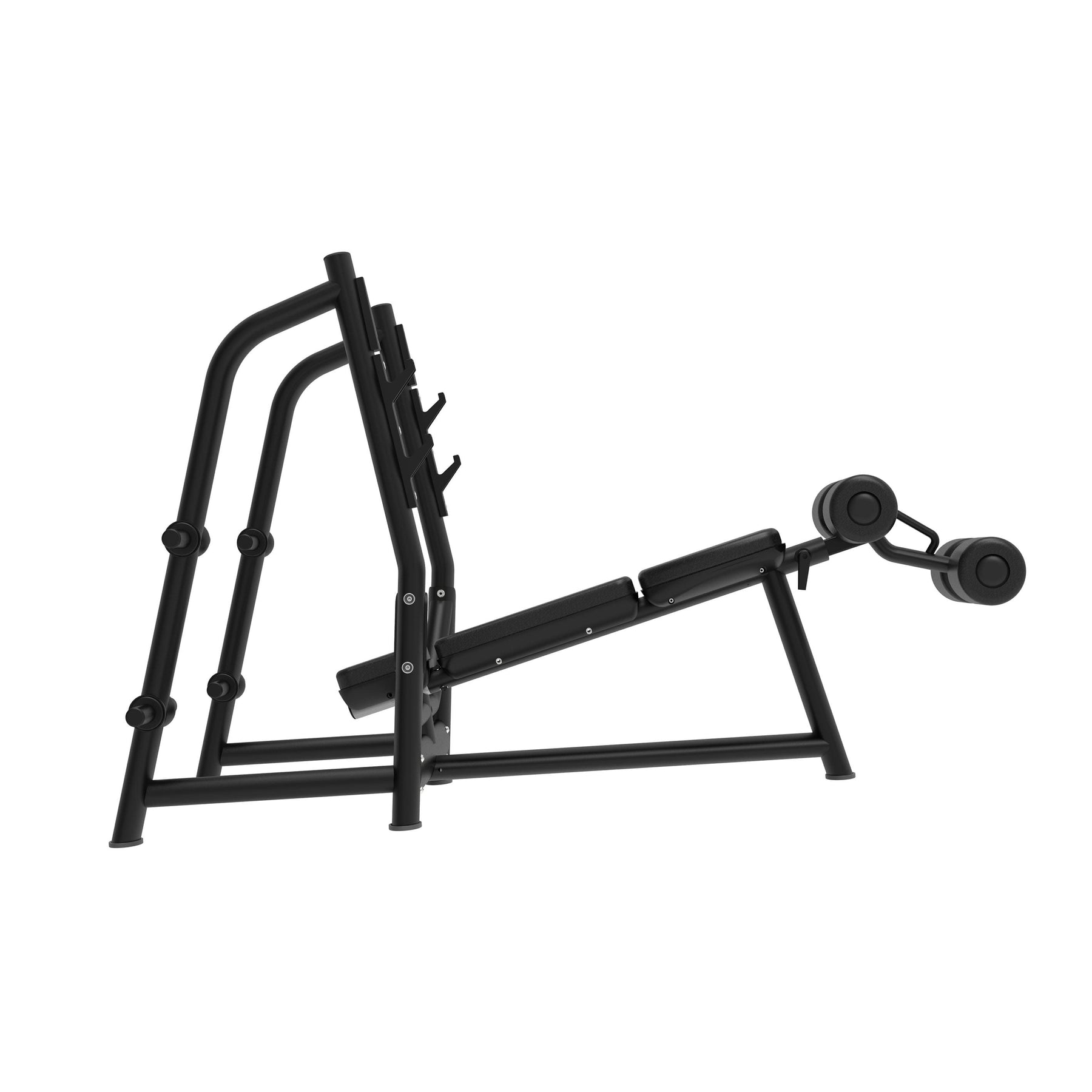 The declined backrest and leg support with padded rollers allow maintaining a firm position throughout the movement, promoting safe and comfortable technique. The bar supports, positioned at different heights, facilitate lifting off and re-racking the weight with full confidence, while the side outlets for plates keep the work area always organized.