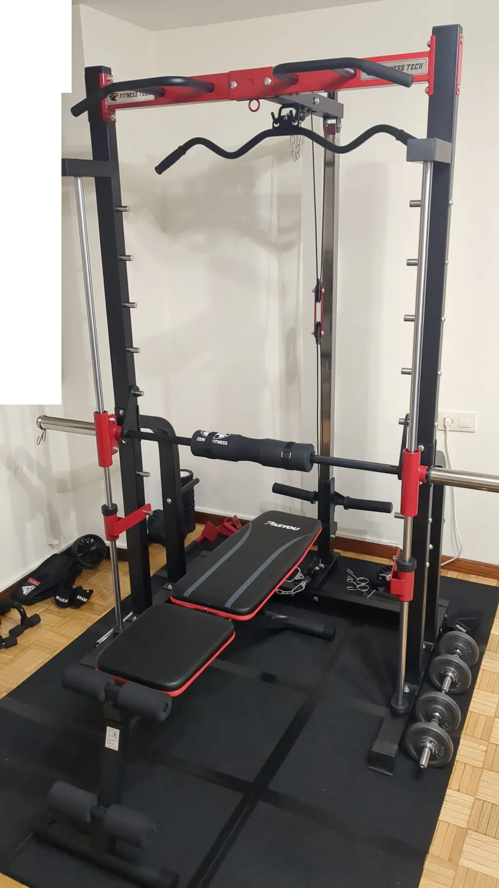 The Smith Machine S13 is a multifunction machine designed to turn your home into a true strength training space. Its robust frame allows exercises such as squats, bench press, weightlifting, pull-ups, pulley work, and exercises for abs, legs, back, and arms, all in a single compact unit.