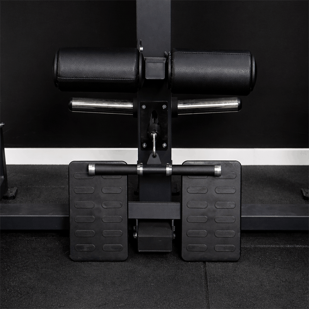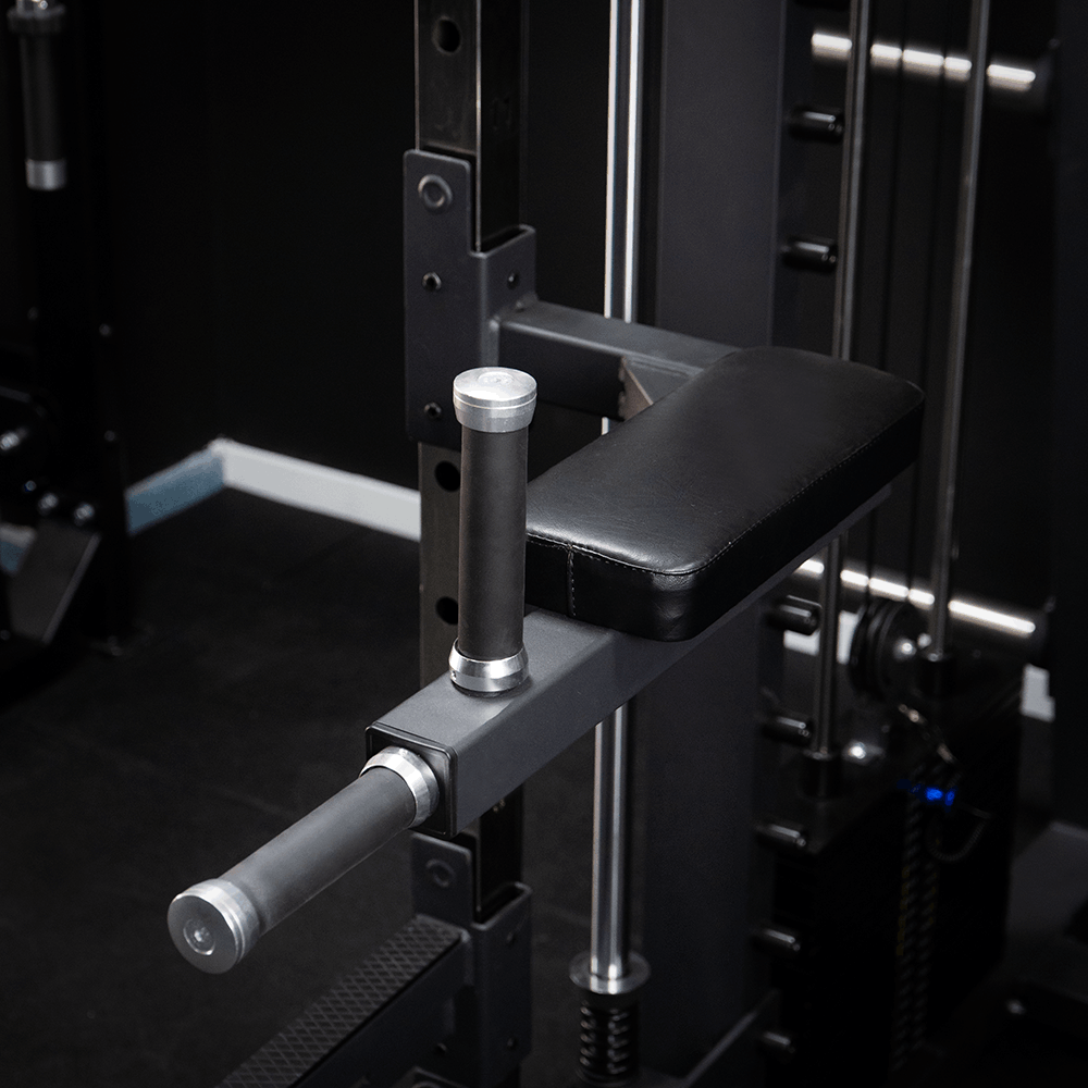 - Inclusief accessoires: Voorste spotters, tricepskoord, rug Pull Bar, D-handvatten, Landmine-accessoire voor T-stang, dipgrepen, duwstang, set van 8 kettingen (8 Link Chain Set) en schuimsteun voor knie.