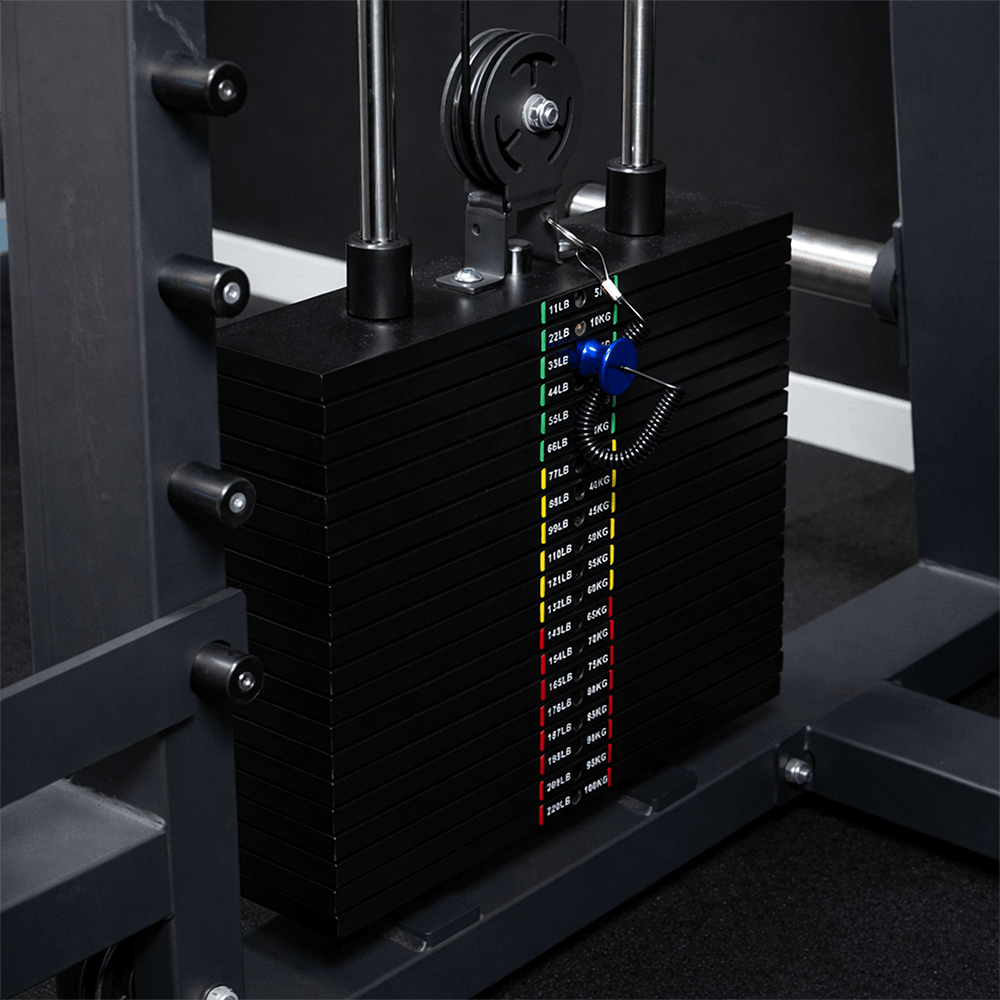 - Inbegrepen selecteerbaar gewicht: 200 kg verdeeld over twee torens van elk 100 kg.